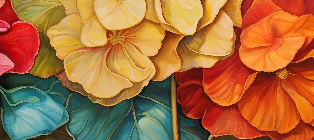 Floral Splendour | Oil Flowers - Dieses farbenfrohe Ölgemälde zeigt ein Trio übergroßer Blumen in satten, warmen Farbtönen, die von tiefem Rot über zartes Gelb bis hin zu Orangerot reichen und spielerisch mit kühlen blauen und grünen Blatttönen durchsetzt sind. Der Stil bewegt sich zwischen Realismus und Expressionismus und erweckt jedes Blütenblatt mit fühlbaren Pinselstrichen auf einem satten dunklen Hintergrund zum Leben.