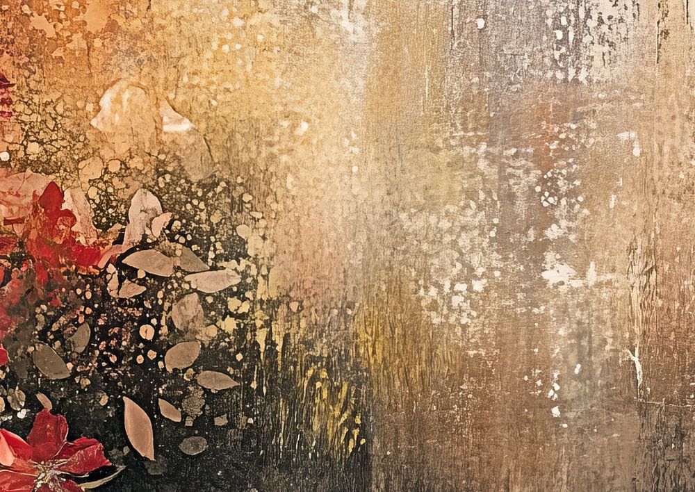 Floral Glow | Twilight Floral - Dieses florale Gemälde kombiniert lebhafte rötliche Blumen auf der linken Seite mit einem Hintergrund aus Gold und dunklen, fast schwarzen Strukturen, die in eine hellere, fast weiße rechte Seite übergehen und einen kontrastreichen und tiefen visuellen Effekt erzeugen.