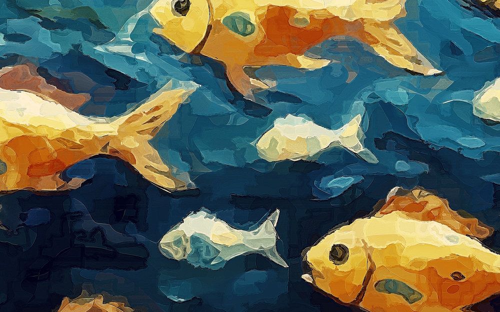Fliehender Fisch. Ein Fischschwarm ist auf der Flucht. Die Jungtiere schwimmen tapfer mit.