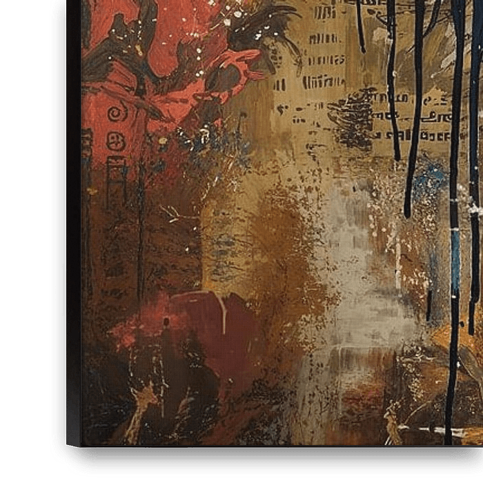 Wing Freedom - Im Mittelpunkt dieses kraftvollen Kunstwerks steht eine nackte Frau mit ausgebreiteten Flügeln, gemalt in einem rohen, ausdrucksstarken Stil, der an Street Art erinnert. Der Hintergrund ist eine dynamische Collage aus Textfragmenten, abstrakten Mustern und deutlichen Farbflecken, wobei die auffällige Kombination aus…