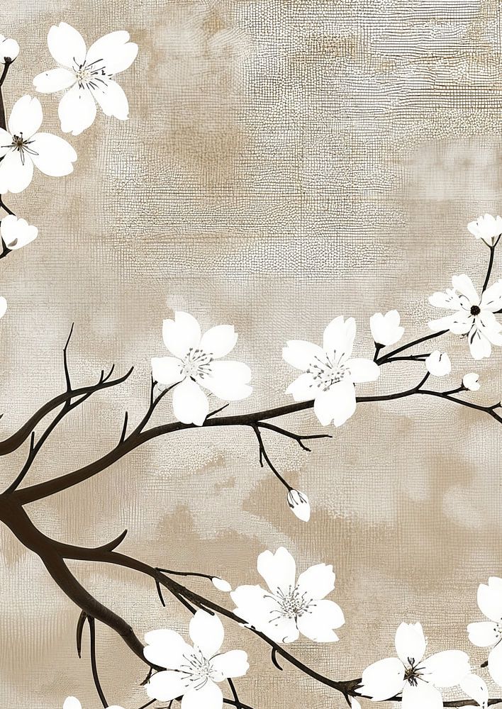 Whispering Blossoms - Dieses florale Gemälde zeigt ein vereinfachtes Bild eines Zweigs mit blühenden Blüten, das in einem monochromen Farbschema gehalten ist. Das Hauptelement des Gemäldes ist der dunkelbraune Zweig, der sich diagonal von links unten nach rechts oben über die Leinwand zieht. An diesem Zweig befinden sich mehrere Äste, die reich mit weißen Blüten verziert sind. Jede Blüte besteht aus fünf einfachen, weißen Blütenblättern mit einer kleinen Ansammlung von gelblichen Punkten in der Mitte, die die Pollenkörner darstellen. Der Hintergrund des Gemäldes besteht aus einem subtilen Muster aus verblassten Blumen und Pflanzenmotiven, die in verschiedenen Beigetönen gehalten sind. Diese stilisierte Darstellung verleiht dem Bild eine ruhige und doch eindrucksvolle Wirkung, die die Schönheit und Reinheit der Natur unterstreicht.