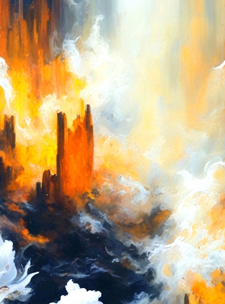 Mit aller Kraft bahnt sich das schäumende Wasser seinen Weg durch die schmalen Schluchten der Hochhäuser. Im Zentrum des Werkes sehen wir die anklagenden Reste eines Gebäudes. Wie Zinnen einer Burg ragen die zerborstenen Steine auf. Der Stadtteil ist von einem ausgebrochenen Feuer orangerot beleuchtet. Doch schon ist die schäumende Gischt eben dabei, die Flammen zu löschen. Immer tosender treiben die Wellen vorwärts, bis die aufgestauten Schaumfetzen von hinten durch die Hochhäuser wieder nach vorn gedrückt wird.
