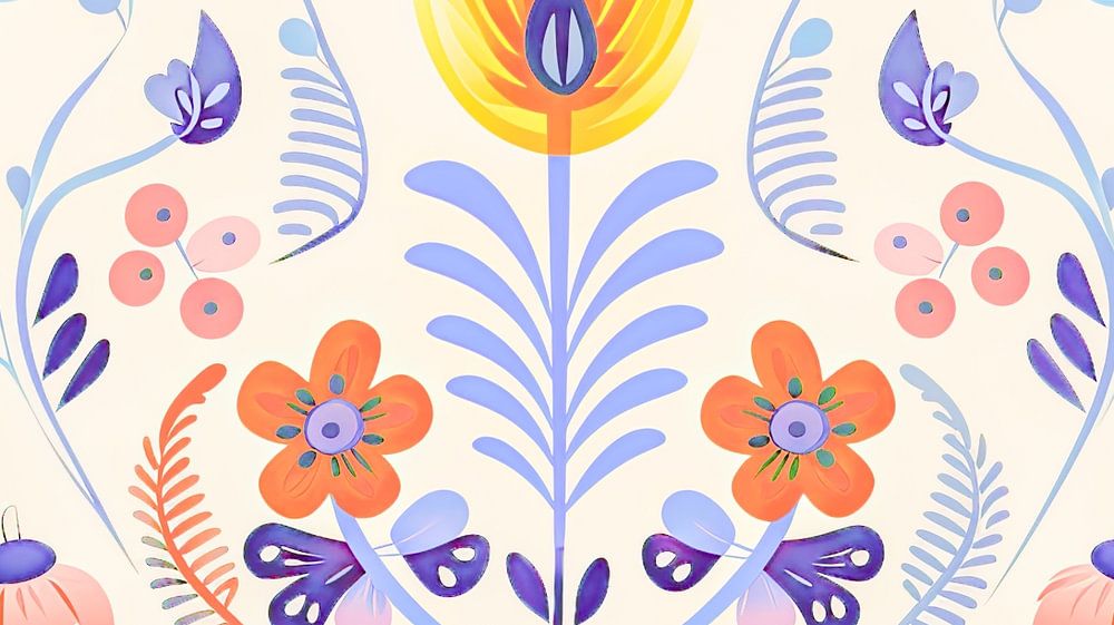 Ein einfaches folkloristisches Blumen- und Pflanzenmuster, inspiriert von der rumänischen Volkskunst. Der Kunstdruck hat ein panoramisches Format. Die Farbpalette orange, gelb, blau, lila vor einem cremeweißen Hintergrund.
