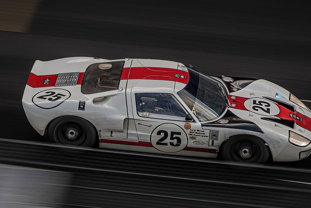 Ford GT40 in der Abenddämmerung auf der Rennstrecke von Spa-Francorchamps während des Sechs-Stunden-Langstreckenrennens von Spa