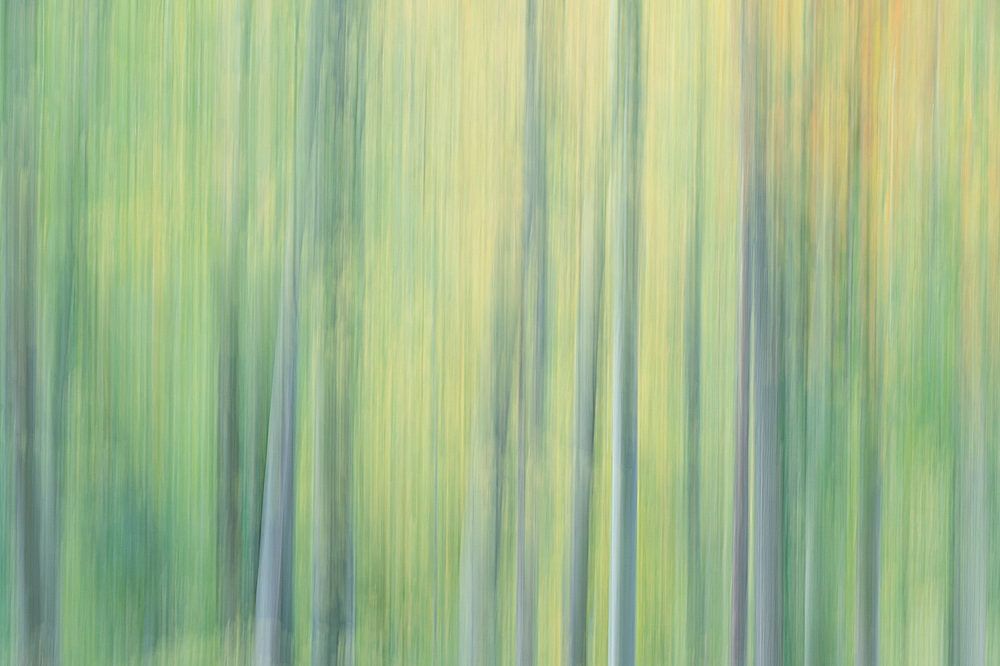 Dieses Bild zeigt eine verspielte und verträumte Waldlandschaft in sanften Pastellfarben. Die vertikale Unschärfe erzeugt einen abstrakten, fast malerischen Effekt, bei dem Grüntöne, Gelbtöne und helle Brauntöne subtil ineinander übergehen. Das Bild strahlt Ruhe und Leichtigkeit aus, als würde man ein impressionistisches Kunstwerk betrachten.