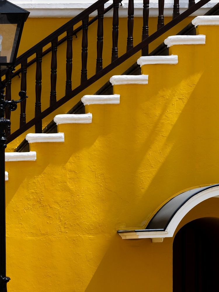 Es ist ein farbenfrohes, charakteristisches Gebäude, das so typisch für die Insel ist. Die gelbe Farbe, die im hellen Sonnenlicht leuchtet, bildet einen schönen Kontrast zu den weißen Teilen und dem schwarzen Holz.