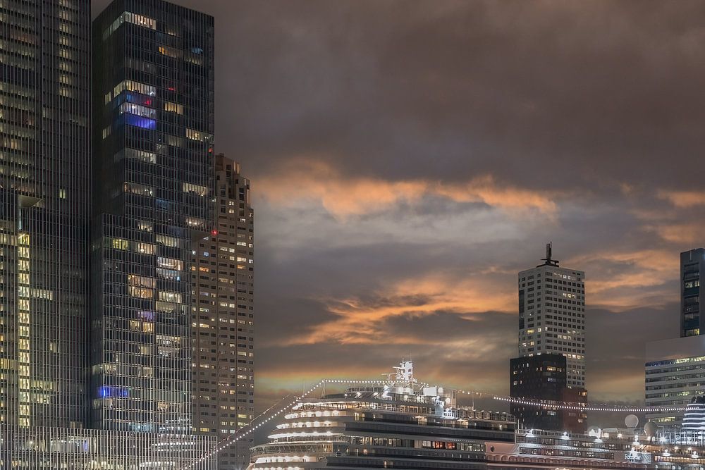 Es unterstreicht viele Facetten, wie z.B.: - Die wunderschöne Architektur des De Rotterdam Montagegebäudes - Eine Kreuzfahrt mit einem luxuriösen Kreuzfahrtschiff, bereit für eine Party - Der warme, farbige Himmel - Alles in allem ist es ein Foto, das sowohl Architektur als auch Abenteuer und Reisen in die Ferne darstellt. Für diejenigen, die bereits eine Reise mit der Holland America Line gebucht haben, ist dieses Foto vielleicht eine schöne Erinnerung daran. Hoffentlich hängt dieses Foto bald in Ihrem Haus oder Büro.