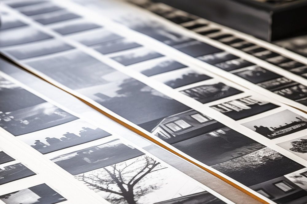 Fotografie Negativstreifen in Schwarzweiß, der Film auf dem Tisch