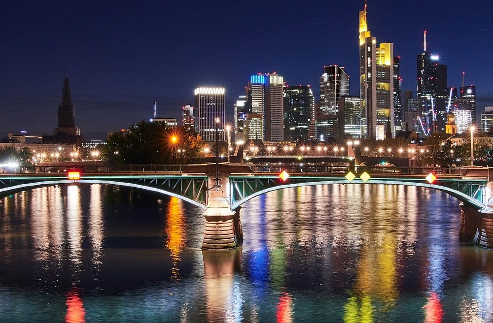 Blick auf die Frankfurt Skyline bei Nacht. Beleuchtete Wolkenkratzer im Finanzdistrikt und die Ignatz-Bubis Brücke spiegeln sich im Main.