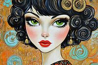 Frau Augen – Auf diesem Frauenbild sehen Sie eine Frau mit großen grünen Augen und auffälligen schwarzen Locken, die mit einem goldenen Haarschmuck verziert sind, vor einem Hintergrund aus warmen Erdtönen und blauen Details.