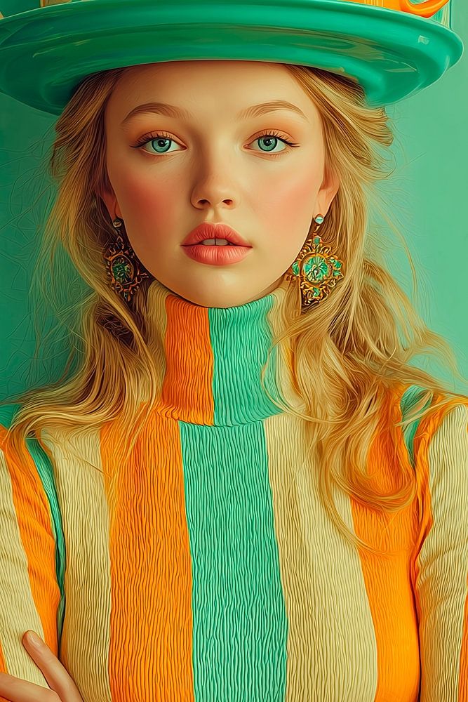 Ein auffallendes Porträt einer Frau mit heiterem Gesichtsausdruck, geschmückt mit einem reich verzierten Blumenkopfschmuck und einem Porzellan-Teeservice. Der Hintergrund ist in einer gedämpften, strukturierten Farbe gehalten, die die Komposition unterstreicht, wobei die Gesamtästhetik Elemente der Mode und des Kunsthandwerks vereint.