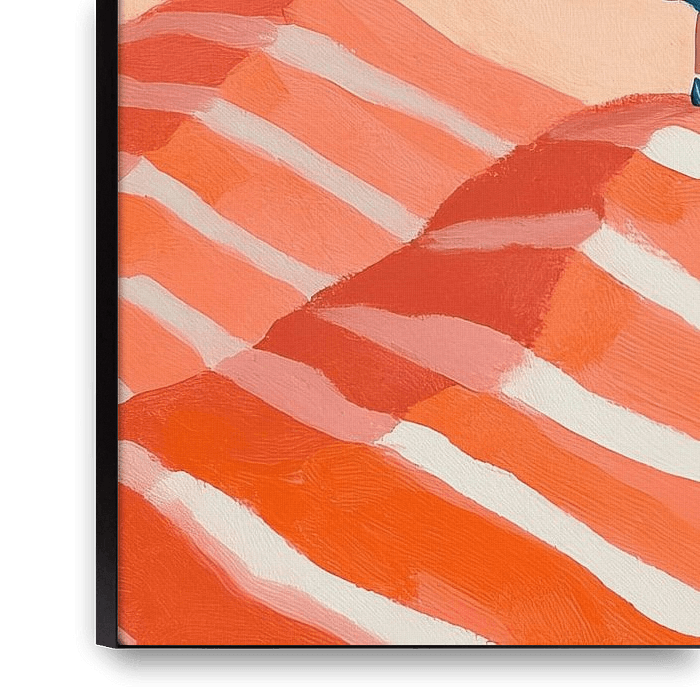 Frau im Freien – Auf diesem Gemälde ist eine Frau in einem gestreiften Rock zu sehen, die auf einem sanft abfallenden Sandhügel steht, umgeben von orangefarbenen und weißen Linien, die die Ebenen bilden, während der Hintergrund einen sanften pfirsichfarbenen Himmel zeigt.