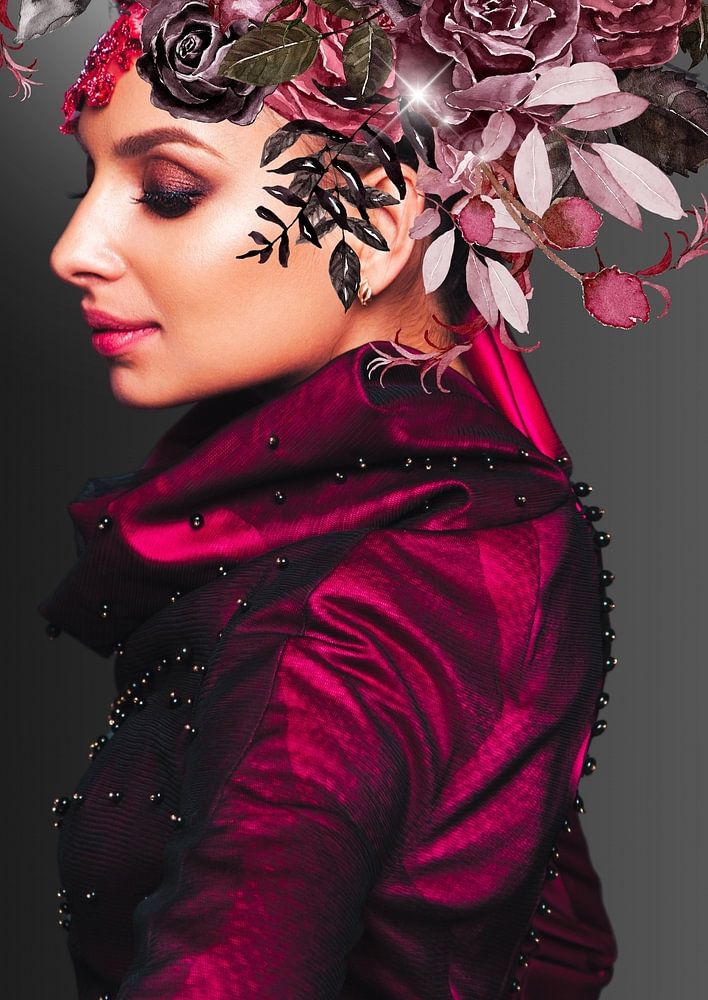 Blumenfrau in Burgunderrot - Kunst mit Augenzwinkern