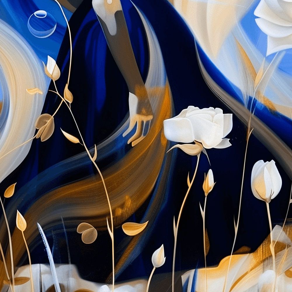 "Woman in a Field of Flowers - 2 | Abstract" ist ein funkelndes Kunstwerk, das an Ihrer Wand erstrahlt. Die Primärfarben Blau und Orange mit einem kleinen Hauch von Schwarz stellen die verschiedenen Farbschattierungen dar. Das Orange geht fließend in das Blau über.
