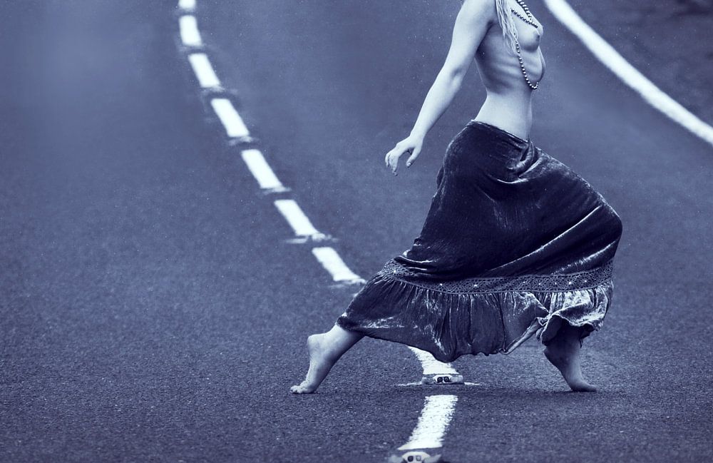 Motiv: Die Frau steht im Mittelpunkt des Bildes. Sie geht in der Mitte der Straße, mit dem Rücken zum Betrachter. Sie trägt einen langen, fließenden Rock und ist oben ohne, so dass ihre Brüste im Bild hervorstechen, und ihr Haar ist zu einem Zopf geflochten.