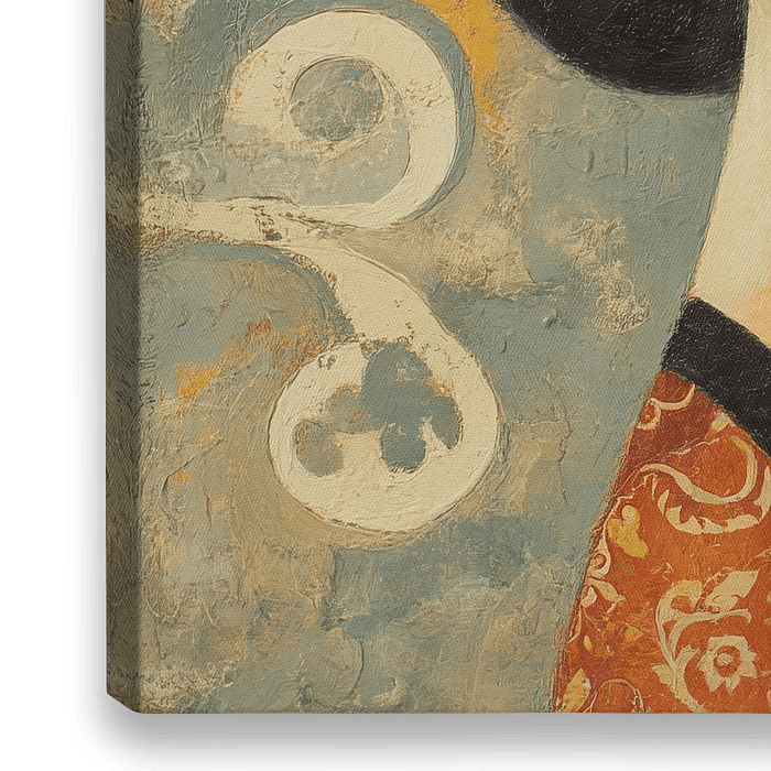 Frau mit Blume - Dieses Porträtgemälde zeigt eine Frau mit elegantem Aussehen und auffallend schwarzem Haar, vor einem Hintergrund aus warmen Gelb- und Blautönen, verziert mit Blumen- und Lockenmotiven.