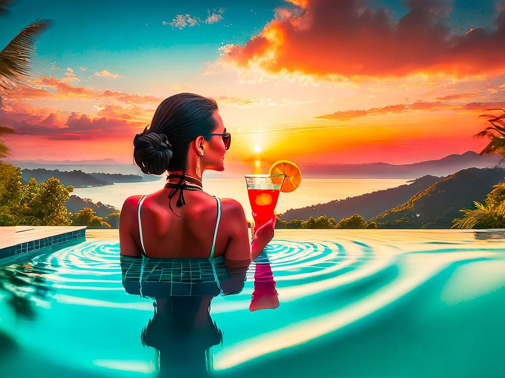 Frau mit Cocktail im Pool und Sonnenuntergang