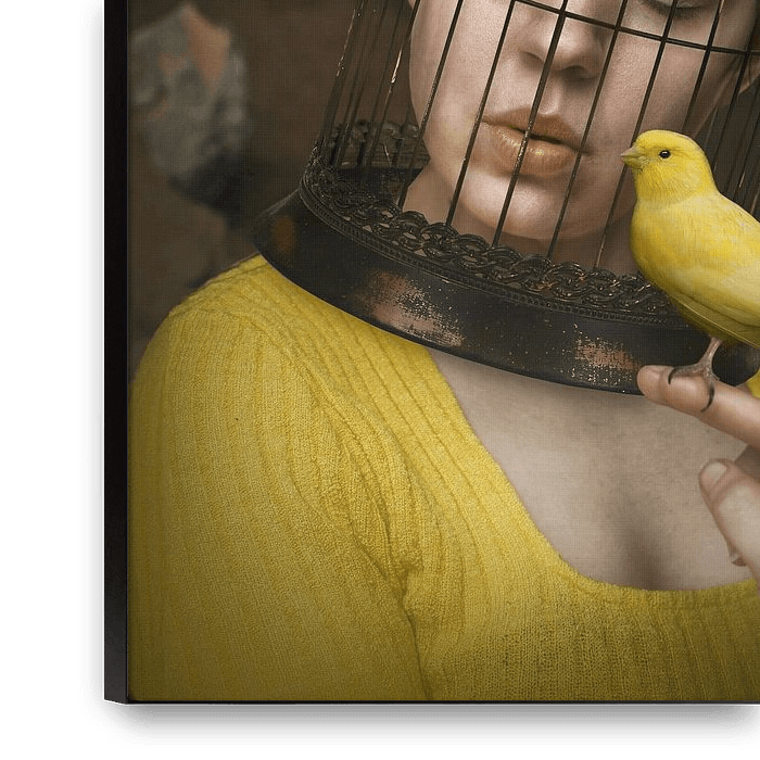 Bestelle dieses Vögel Wandbild Frau mit Vogelkäfig und Kanarienvogel in der Kohlengrube - Symbolik von Mensch und Natur von Elianne van Turennout als Reproduktion auf Leinwand, Alu-Dibond, als Poster, Fototapete, ArtFrame oder Acrylglasbild, maßgefertigt in höchster Qualität.