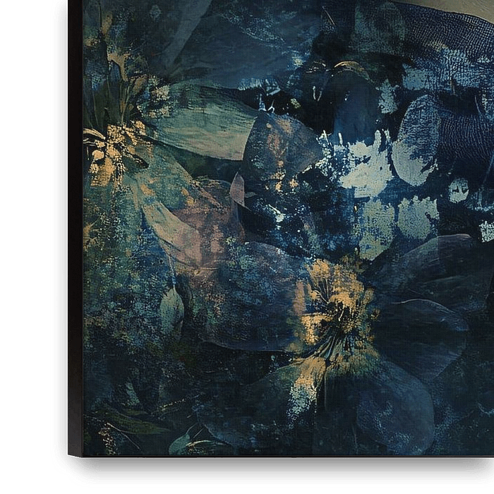 Dieses wunderschöne Kunstwerk zeigt ein geheimnisvolles Porträt einer Frau mit intensiven Augen, die direkt in die Seele zu blicken scheinen. Ihr Gesicht ist teilweise hinter einem Schleier in tiefen Blautönen verborgen, was eine geheimnisvolle Aura schafft. Blumen in denselben Blau- und Gelbtönen umrahmen ihr Gesicht und verleihen ihm…