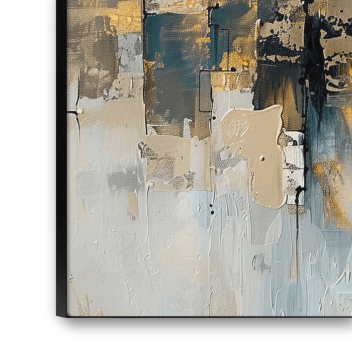Frauen - Dieses Frauengemälde zeigt das ätherische Porträt einer Frau, das in einer bemerkenswerten Verschmelzung von abstrakten und realistischen Elementen dargestellt ist. Das Gesicht der Frau, das in ruhigen und weichen Beige-, Weiß- und Grautönen dargestellt ist, erscheint vor einer Leinwand, die mit scheinbar verstreuten und unregelmäßigen quadratischen und rechteckigen Blöcken bedeckt ist. Diese Blöcke, von denen einige leicht strukturiert und andere glatt sind, variieren in ihrer Farbe von tiefem Blaugrau bis zu Gold und Ocker, wobei einige durchscheinende Spuren der darunter liegenden Schichten aufweisen. Durch die Schichtung und die räumliche Verteilung der Blöcke entsteht die Illusion, dass Teile ihres Gesichts sowohl auftauchen als auch wieder verschwinden, was zu einem rätselhaften und dynamischen visuellen Effekt beiträgt. Das Gemälde spielt mit dem Konzept von Fragmentierung und Einheit, wobei die harmonischen Farben und fließenden Übergänge dem Werk eine weiche, fast traumartige Qualität verleihen.