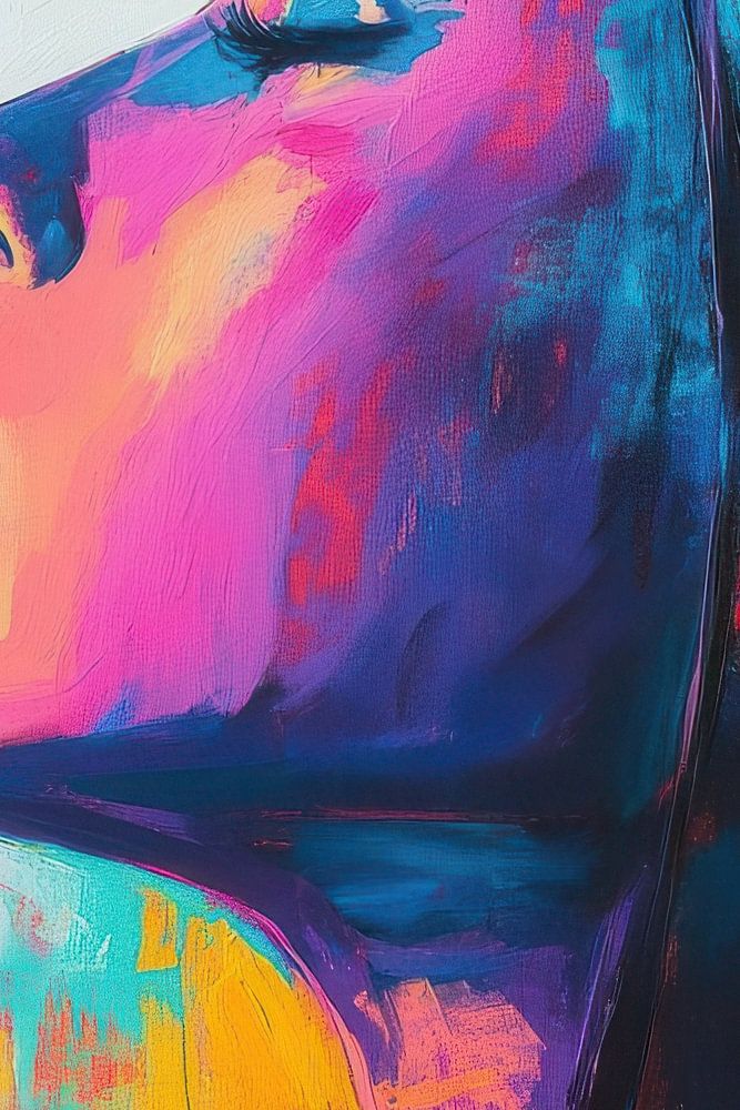 Weibliches Porträt | Farbgeflüster - Dieses farbenfrohe Porträtgemälde zeigt das Seitenprofil einer Frau, deren Gesicht und Hals in lebhaften und kontrastreichen Pinselstrichen in Rosa, Blau, Violett und Gelb wiedergegeben sind. Ausdrucksstarke Pinselstriche und der Einsatz von Farbe betonen die emotionale Tiefe des Porträts.