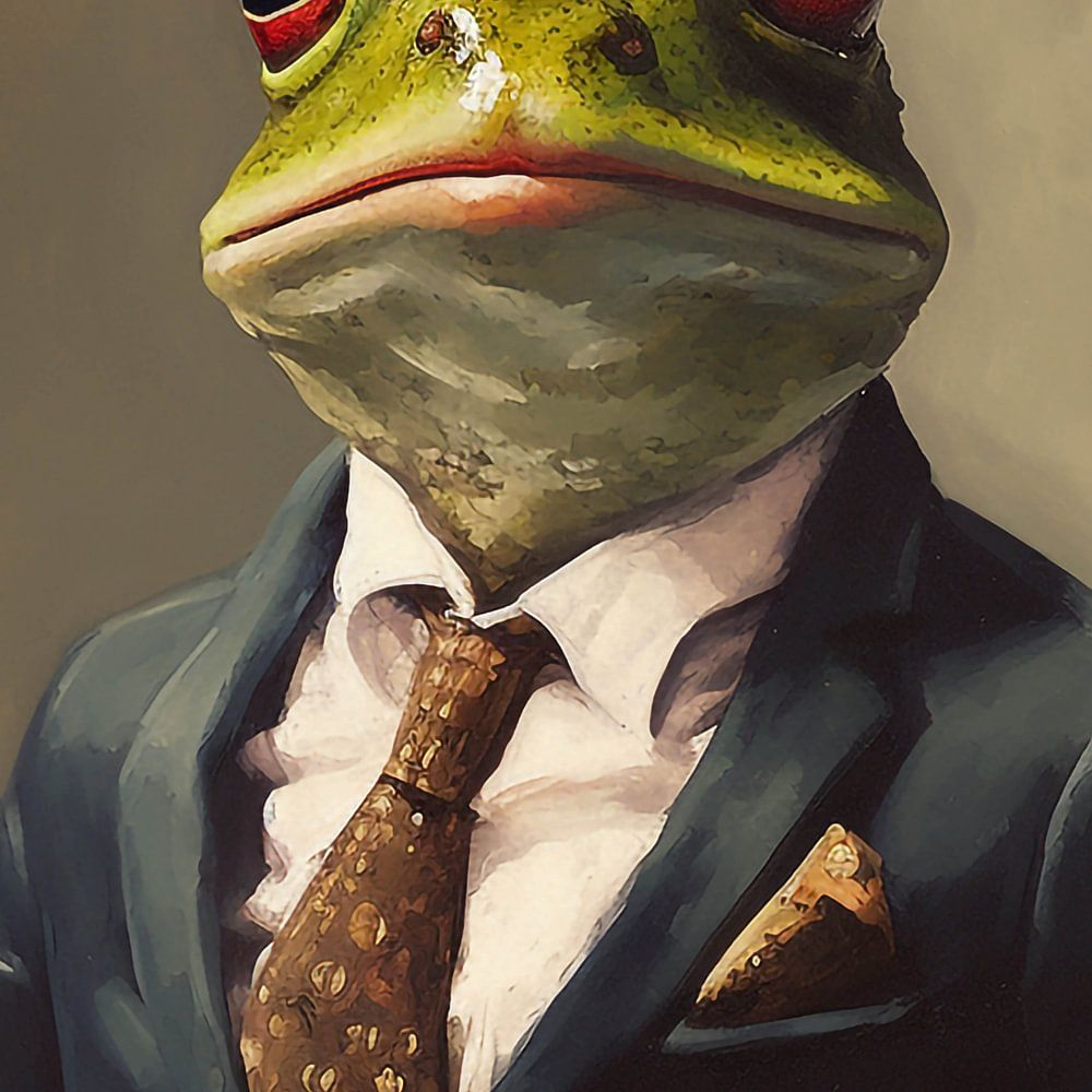 Stellen Sie sich ein Kunstwerk vor, eine Ausstellung, die Sie in eine Welt voller Fantasie und Humor entführt. In der Mitte der Leinwand erscheint das schöne Porträt eines Frosches in einem adretten Anzug.