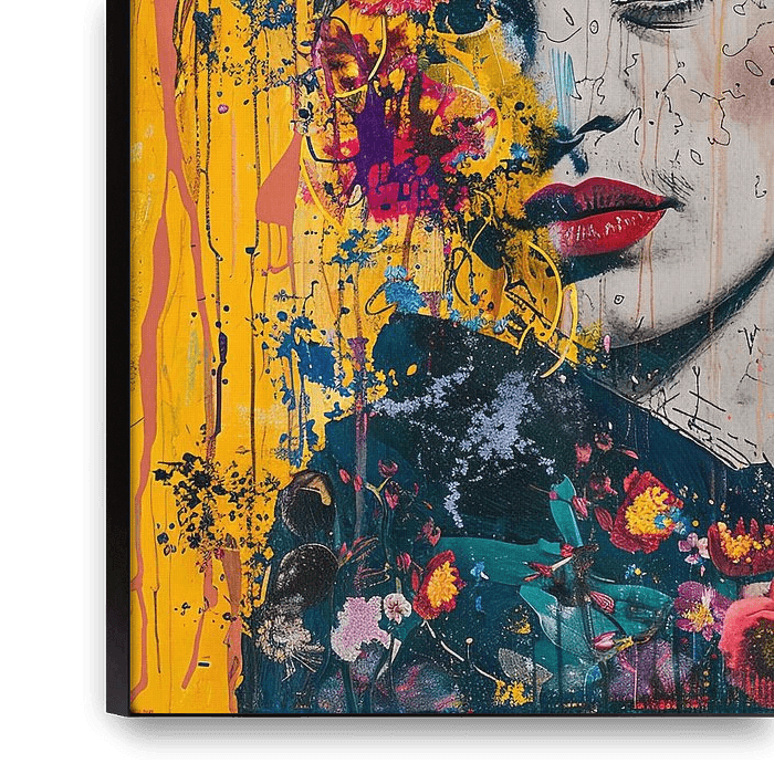 Die starke Präsenz Fridas wird in diesem Bild von einer üppigen Blumenpracht umrahmt, die das Porträt mit Lebendigkeit und Farbenfreude erfüllt. Die sorgfältige Auswahl und Positionierung jeder Blüte spiegelt die bewusste Komposition der Künstlerin wider, die gleichzeitig wilde Natur und durchdachte Ästhetik darstellt. Dieses Kunstwerk…