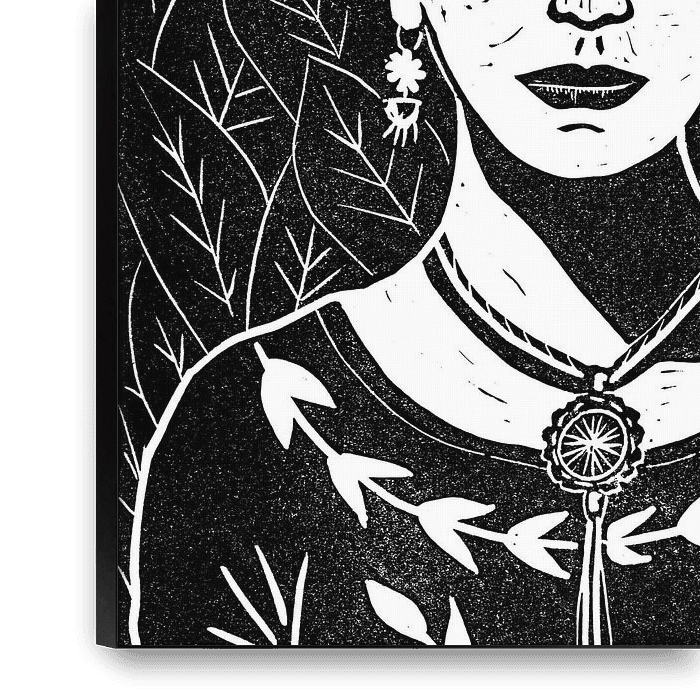 Schwarz-Weiß-Grafik der Künstlerin Frida, einer der inspirierendsten Frauen der Kunstgeschichte. Reproduktion eines handgemachten Linolschnitts.