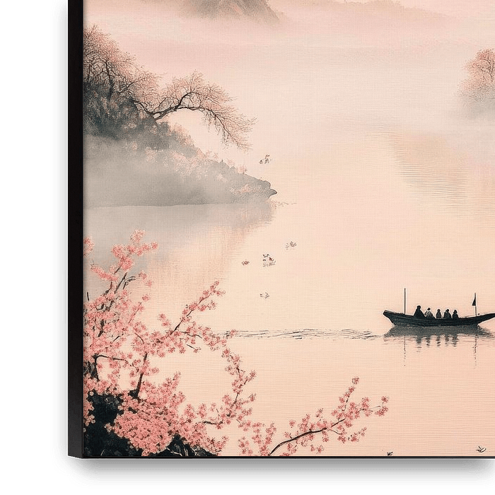 Eine sanfte Morgendämmerung umhüllt die ruhige Wasserfläche, während zarte Kirschblüten das Bild mit ihrem zarten Rosa akzentuieren. Die majestätischen Berge im Hintergrund verlieren sich in einem mystischen Nebel und laden zum Träumen ein. Ideal für ein Schlafzimmer, bietet dieses Kunstwerk einen friedlichen Rückzugsort für entspannte…