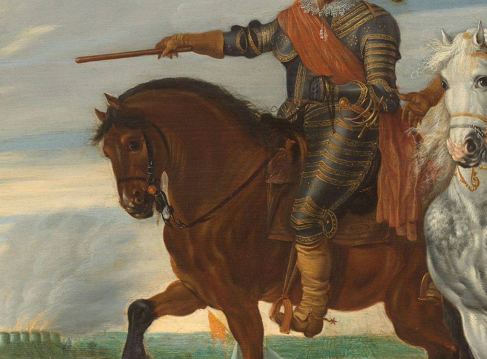 Friedrich Heinrich und Ernst Casimir bei der Belagerung von Den Bosch, Pauwels van Hillegaert Triumphierend sitzen Prinz Friedrich Heinrich und sein Cousin Graf Ernst Casimir auf ihren Pferden vor Den Bosch. Frederick Hendrik zeigt mit seinem Kommandostab auf die belagerte Stadt, die gerade gestürmt wird. Frederick Henry trug nicht umsonst den Spitznamen "der Stadtvollstrecker". Er eroberte eine Reihe von Städten von den Spaniern. Den Bosch war 1629 einer der wichtigsten.