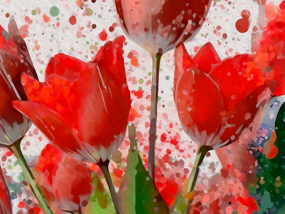 Dieses Gemälde ist eine frische, moderne Interpretation des klassischen Blumenstilllebens. Der Aquarell-Effekt mit Farbspritzern und der ausgeprägte Einsatz von Farbe machen dieses Werk zu einem echten Blickfang.