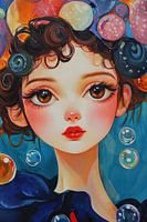 Fröhliches Mädchen mit bunter Frisur - Dieses Frauengemälde zeigt ein Mädchen mit großen, ausdrucksstarken Augen und einem auffälligen, mit bunten Kreisen geschmückten Haarschopf. Ihre Haut wirkt gleichmäßig und weich vor einem fröhlichen blauen Hintergrund mit Luftblasen.