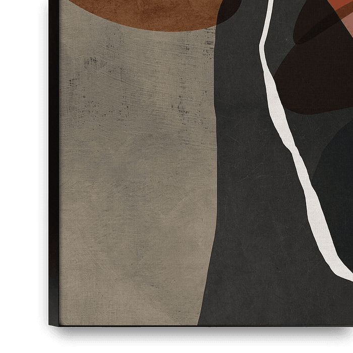 Minimalistisch abstraktes Werk mit geometrisch abgerundeten Formen und Farbtönen in dunkelgrau, braun, pink und schwarz.