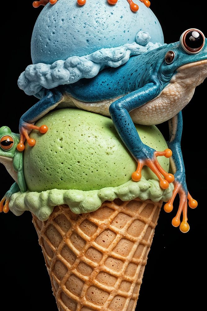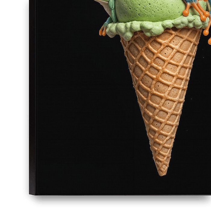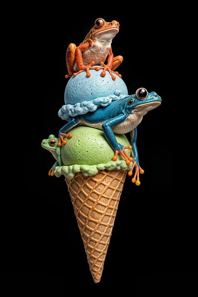 Dies ist eine farbenfrohe Hommage und Neuinterpretation eines bekannten Motivs, das drei leuchtend bunte Frösche auf einer Eiskugel in einer Waffeltüte zeigt. Das surreale und lustige Kunstwerk ist ein absoluter Blickfang und eignet sich hervorragend als moderne Wanddekoration. Es kombiniert spielerisch Tier- und Dessertmotive im…