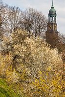 Frühling am Hamburger Michel. Durch die Reflexion der Elbe beginnt hier der Frühling etwas früher. Im Hintergrund das Wahrzeichen Hamburgs.