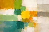 Dieses erfrischende abstrakte Kunstwerk besticht durch seine lebendige Textur und eine harmonische Farbkomposition, die an die ersten warmen Tage des Jahres erinnert. Das Bild präsentiert sich als ein Patchwork aus dicht aufgetragenen, rechteckigen Farbfeldern, die wie eine moderne Ziegelwand oder ein kunstvolles Mosaik wirken. Helles…