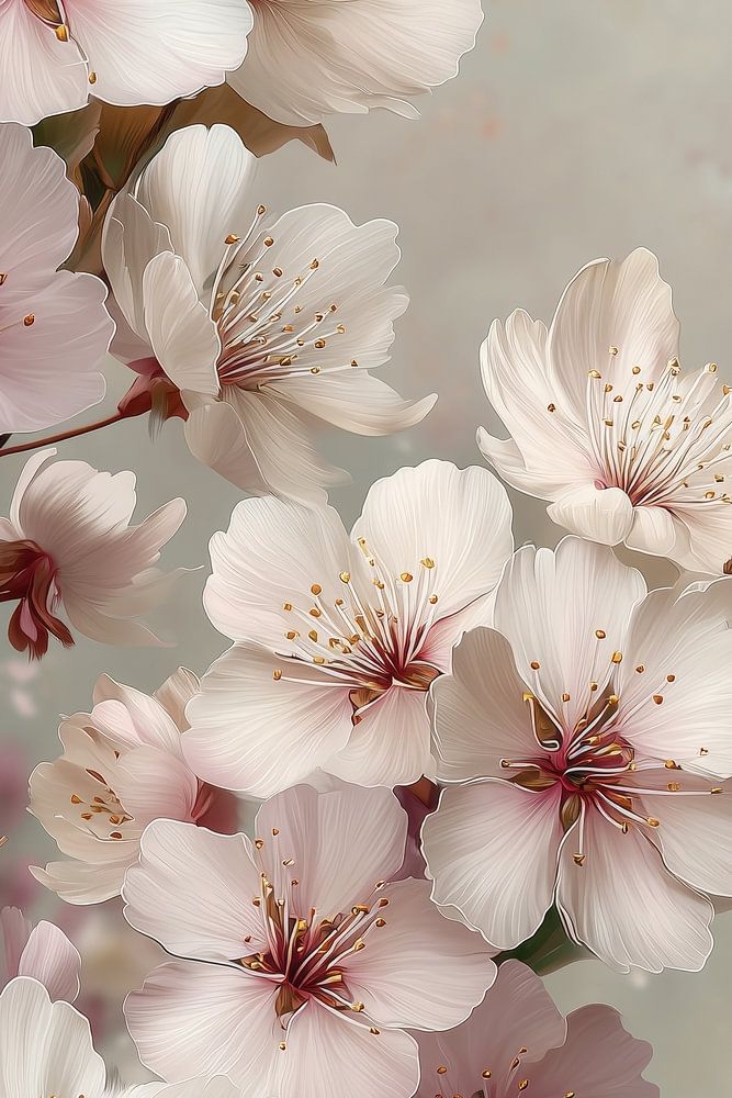 Die Farbnuancen sind von bestechender Subtilität - von den zartesten Rosatönen über cremiges Weiß bis hin zu den warmen Brauntönen der Zweige. Jede Blüte scheint individuell beleuchtet zu sein, wobei das Licht die feinen Strukturen der Blütenblätter hervorhebt und ihnen eine fast transparente Qualität verleiht. Die goldenen Staubgefäße setzen kleine, aber wirkungsvolle Akzente.