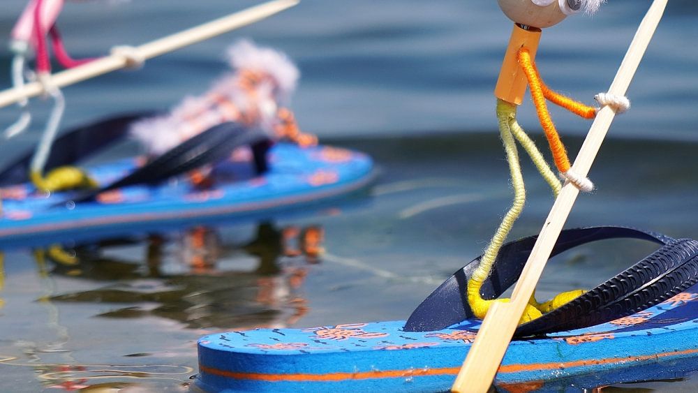 Fubby spielt auf dem Wasser mit Flip-Flop-Pantoffeln, die als Paddelbretter benutzt werden.