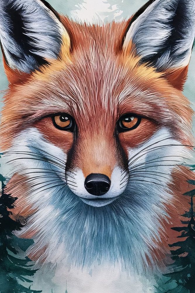 Dieses wunderschöne Kunstwerk zeigt einen majestätischen Fuchs, der aus einer Waldlandschaft aufzutauchen scheint. Der Fuchs mit seinen scharfen Augen und seinem detaillierten Fell steht im Mittelpunkt des Designs, während im Hintergrund die Silhouette eines Rehs zwischen den üppigen Bäumen zu sehen ist. Die Farben sind reichhaltig und lebendig, mit einer Dominanz von Orange, Grün und Blau, was dem Kunstwerk ein dynamisches und natürliches Aussehen verleiht. Dieses Gemälde ist perfekt für jeden, der Natur und Tiere liebt, und es wird sicherlich ein auffälliger und stilvoller Akzent in jedem Wohnzimmer, Büro oder anderen Raum sein, in dem Sie es aufhängen. Eine brillante Ergänzung für jeden Kunstliebhaber!