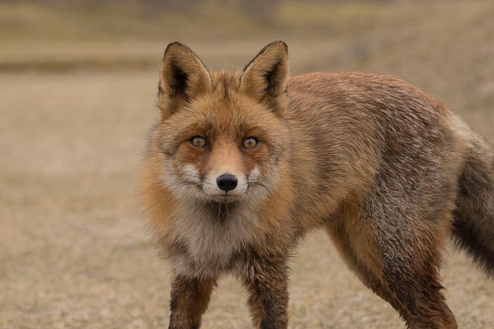Ein Fuchs schaut aufmerksam und nimmt eine abwartende Haltung ein