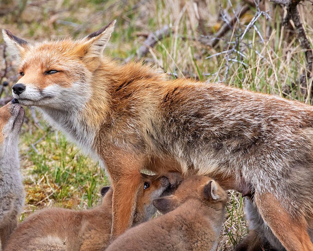 Die Fuchsmutter gibt ihren fünf Jungen zu trinken. Made in North Holland und sind nur wenige Wochen alt.