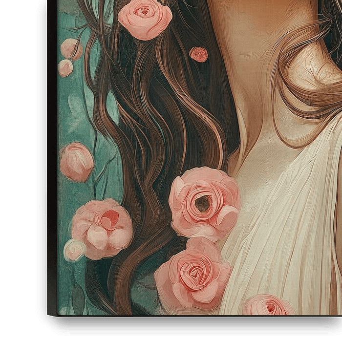 Dieses digitale Kunstwerk zeigt das Porträt einer jungen Frau, umgeben von einer üppigen Fülle rosa Rosen. Ihr nach oben gerichteter Blick und ihre kecke Haltung lassen auf einen Moment des Staunens oder der Offenbarung schließen. Die hyperrealistischen Details ihres Gesichts, einschließlich der subtilen Sommersprossen, stehen im…