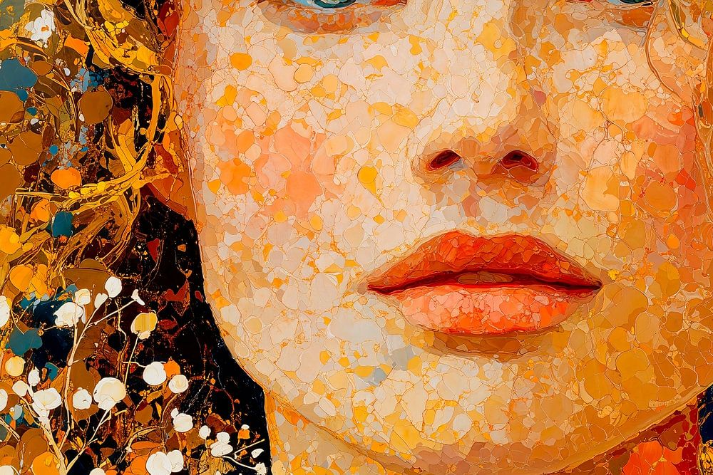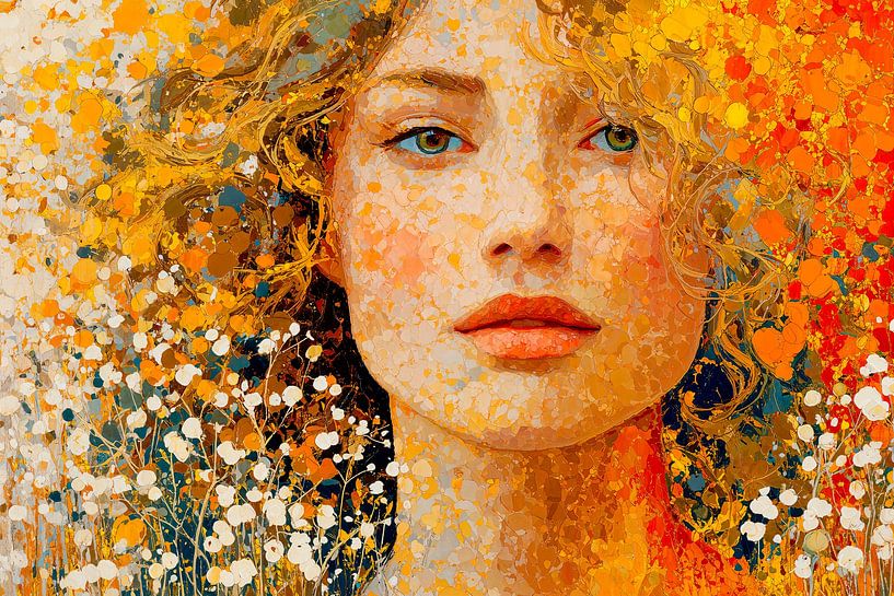 Das Porträt einer Frau mit weichem, lockigem Haar, das ihr Gesicht umrahmt. Ihr Ausdruck ist heiter und nachdenklich, mit vollen Lippen und einer leichten Röte auf den Wangen. Der Hintergrund ist eine lebendige Mischung aus Farbtönen, die an ein blühendes Feld erinnern. Weiße Blumen sind im Vordergrund verstreut und stehen im Kontrast…