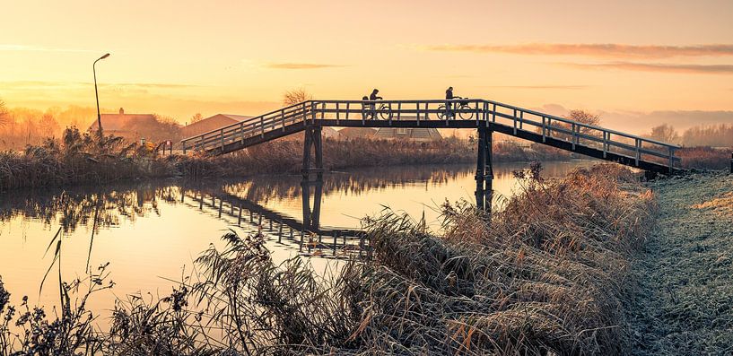Erster Wintermorgen mit Nebel und Frost im Polder, dem Berkmeer, und dieses Foto wurde während der goldenen Stunde kurz nach Sonnenaufgang aufgenommen