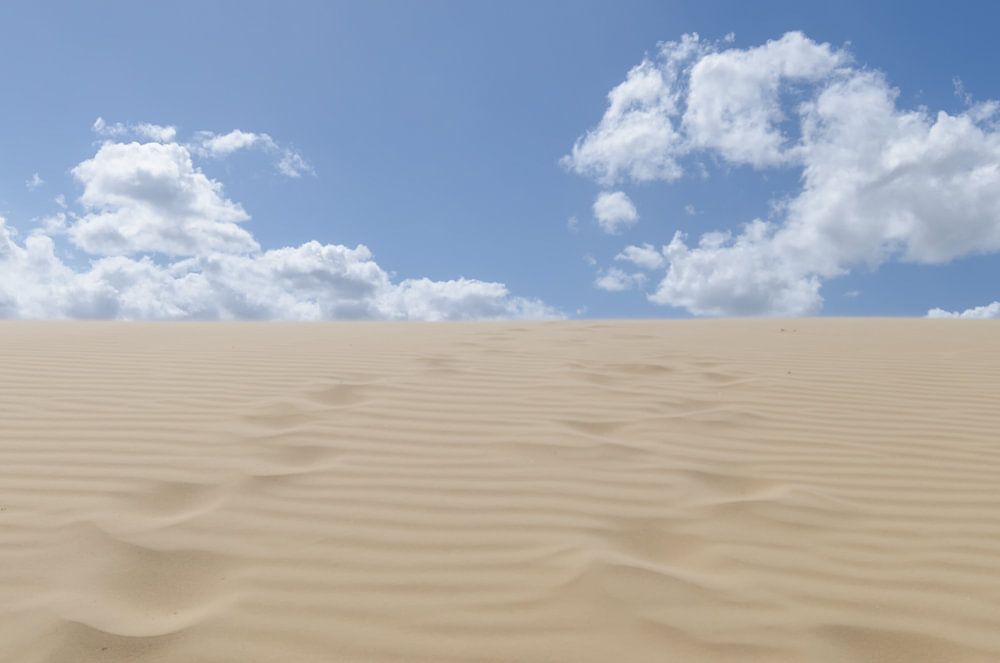 Schritte im Sand durchbrechen das vom Wind geschaffene Muster. Die Strecke führt den Sandhügel hinauf, zum blauen Himmel mit den weißen Wolken.