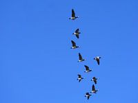 Ein Schwarm Gänse im Flug über Ahrenshoop auf dem Darß in Deutschland.