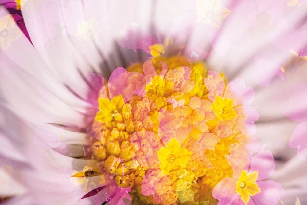 Märchenhafte Naturfotografie von Gänseblümchen und Primelblüten in wunderbar lebhaften Frühlingsfarben. Mit der speziellen Aufnahmetechnik der Mehrfachbelichtung innerhalb der Kamera wurden das Gänseblümchen und die Primelblüten so kombiniert, als ob sie miteinander tanzen würden.
