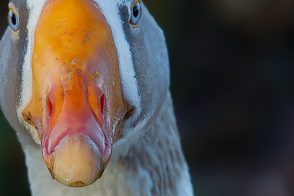Gänse, sowohl Wildgänse als auch "Hobbygänse", sind im Volksmund oft wenig bekannt. Ihre Fäkalien sind ein Ärgernis für Landwirte. Und wenn man Pech hat, ist auch das eigene Auto damit "bedeckt". Ich hingegen finde Gänse wunderschön. Wenn sie laut schnatternd fliegen, sehe ich ihnen mit größtem Vergnügen zu. Aber diese Gans hat mich ganz erstaunt angeschaut. Mit ihren kleinen blauen Augen! Eine Hobbygans, aber sehr ausdrucksstark. Auf dem Foto: Sie!