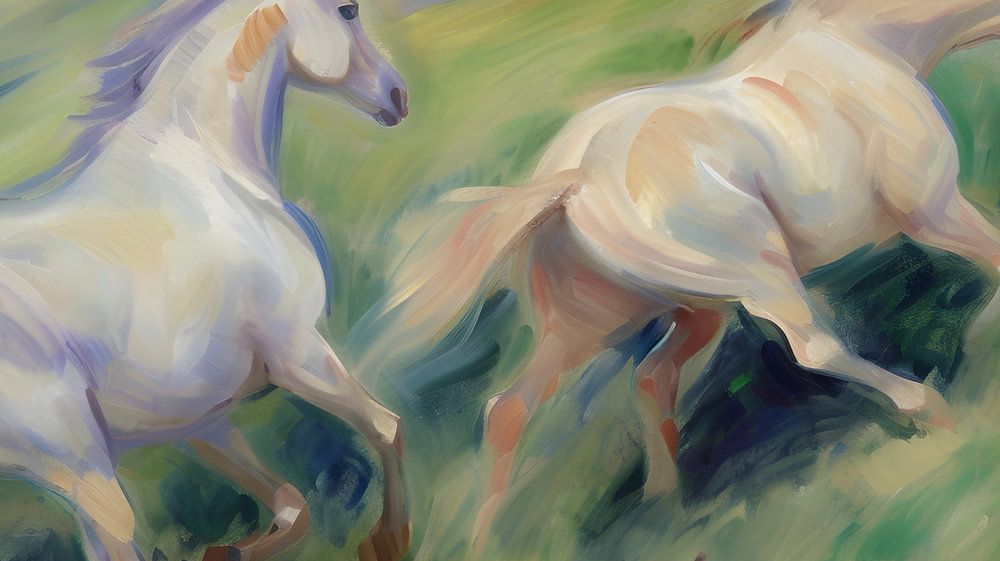Eine Impression von zwei galoppierenden Pferden. Der Stil ist von Berthe Morisot inspiriert. Das Kunstwerk ist für Räume mit ländlichen Themen geeignet.