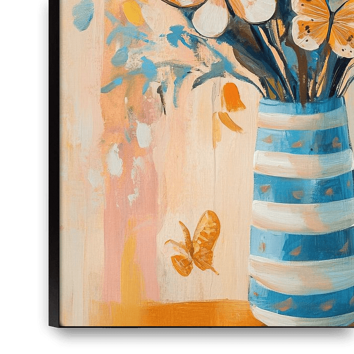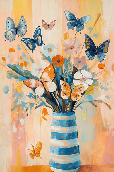 Garten Schmetterlinge | Fröhliches Gartengemälde - Dieses Gemälde zeigt einen bunten Blumenstrauß mit fröhlichen Schmetterlingen, die darüber flattern, alles in einem frischen, modernen Stil mit weichen Farben und hübschen Formen.
